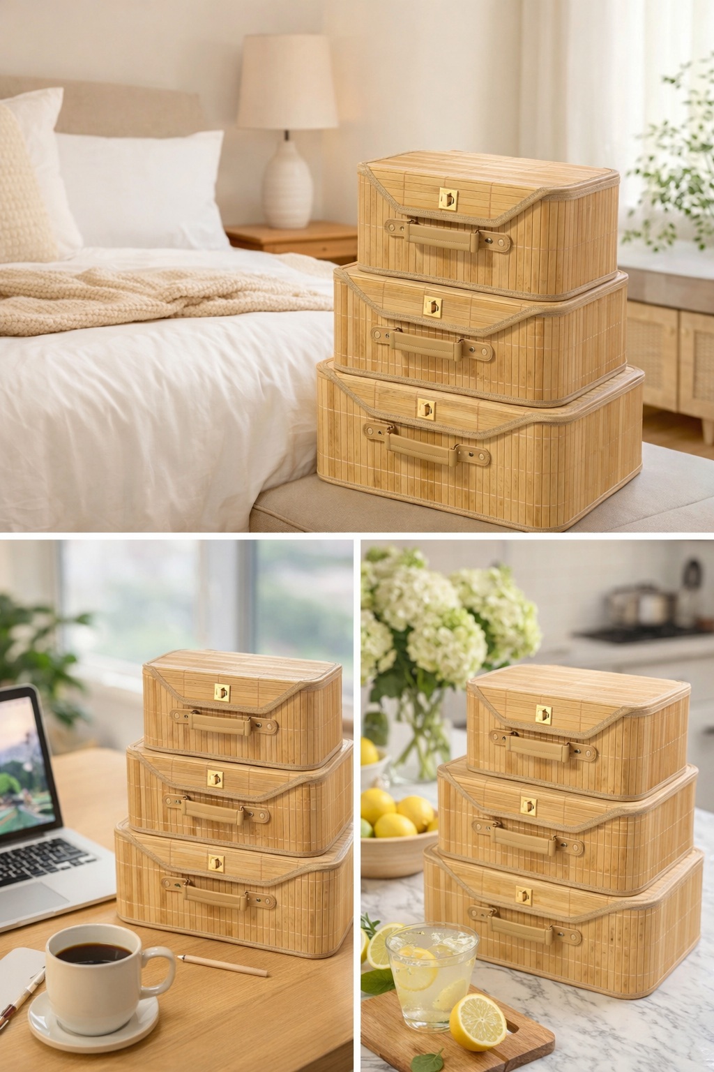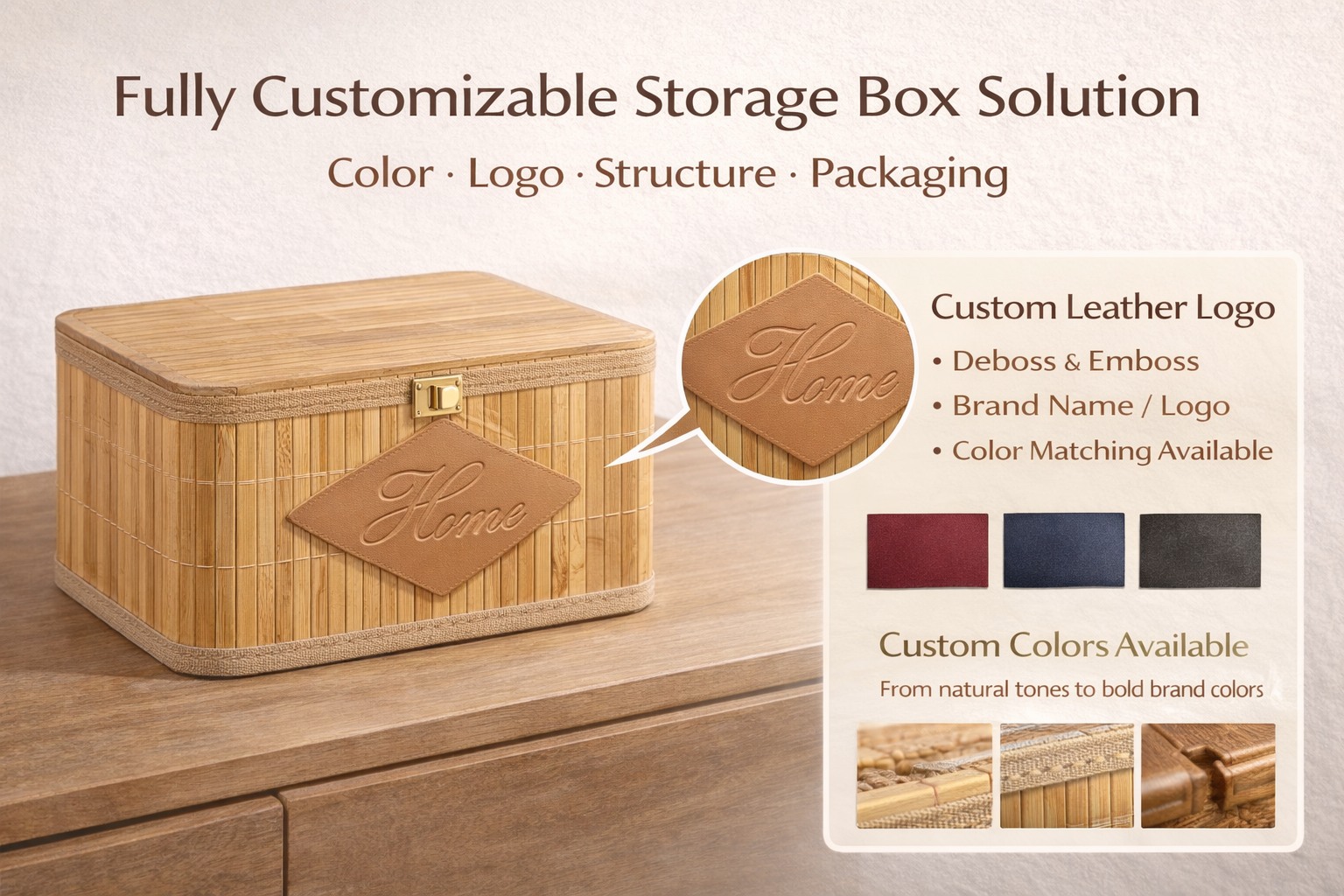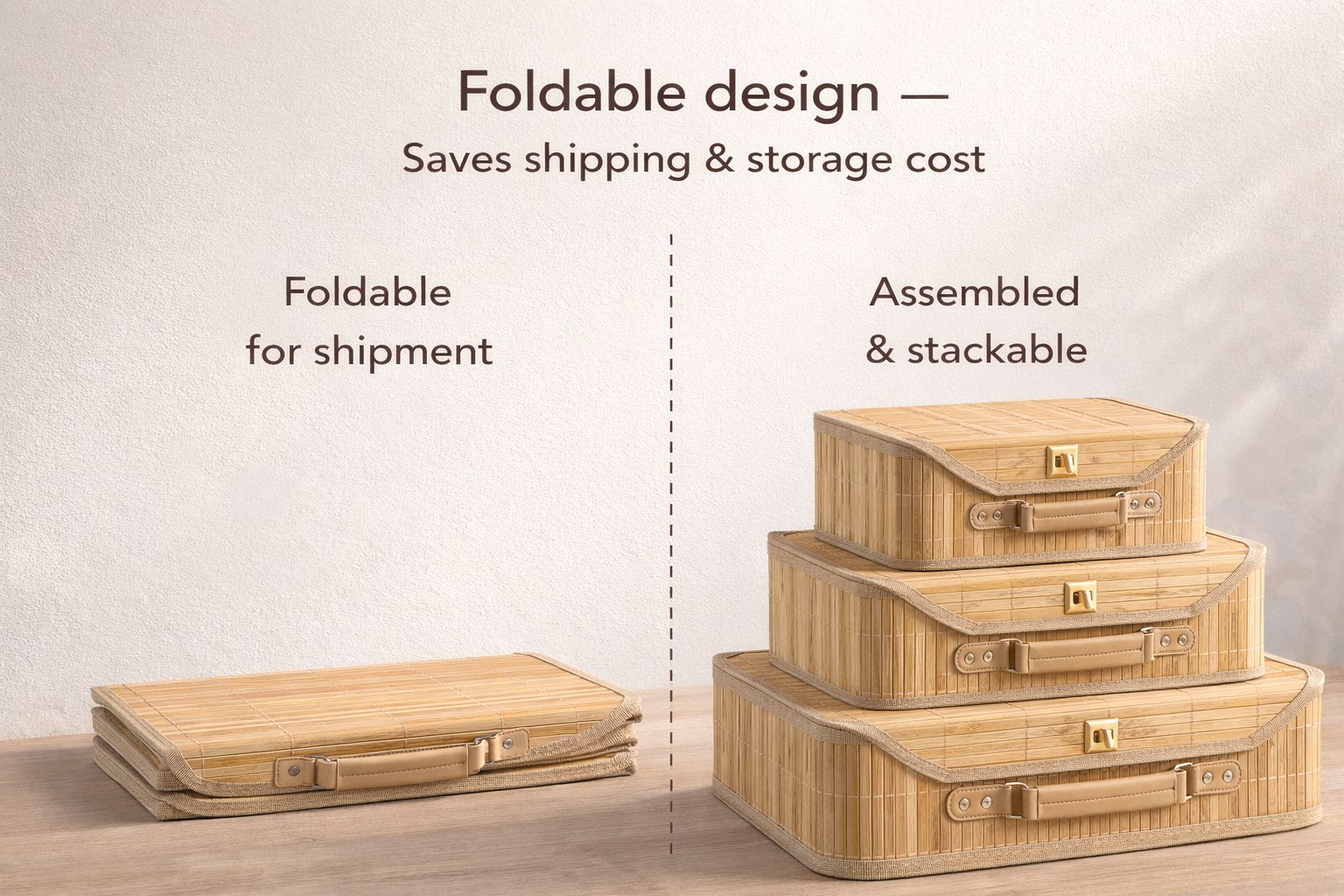 Foldable bamboo storage box designed to save space and reduce shipping volume. Durable bamboo panels with fabric trim, handle and metal lock. Ideal for home storage, travel or gift packaging.
